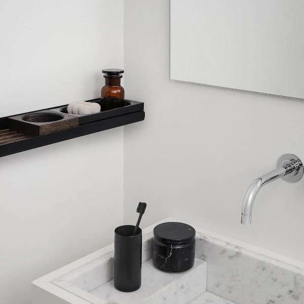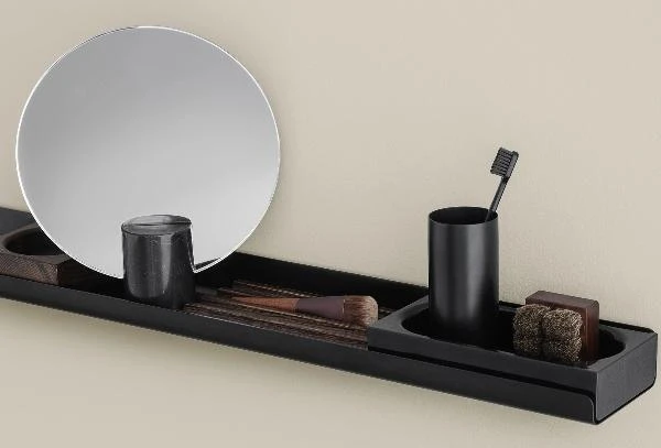 blomus MODO Wall Shelf is a small and intelligent multi-functional shelf that allows for customization according to individual needs and preferences. The beautiful shelf made of titanium-coated stainless steel is timeless and elegant with its black powder finish. The shelf coordinates with other bath accessories from the MODO line and is made to contain MODO organizers to neatly display toiletries, makeup, hair accessories and even the MODO soap dispenser or tumbler. (Accessories for the Wall Shelf include the Square or Rectangular Wood Tray or the Acrylic Tray).Â