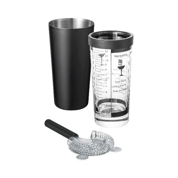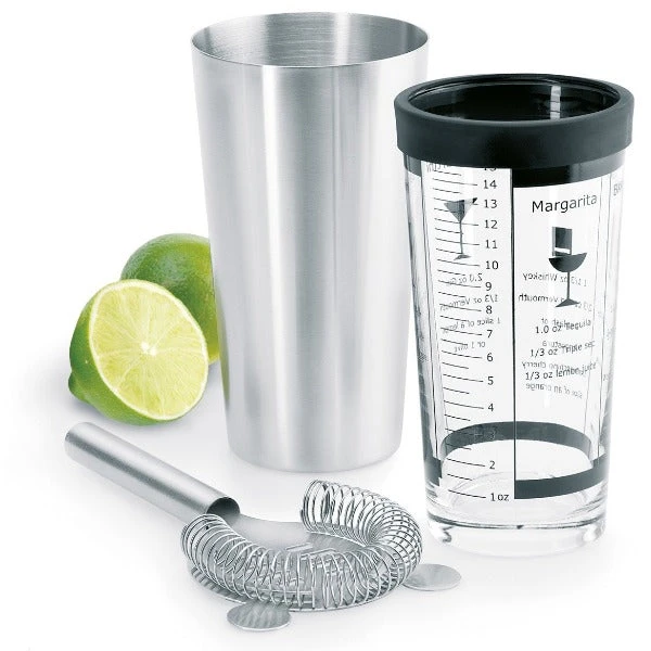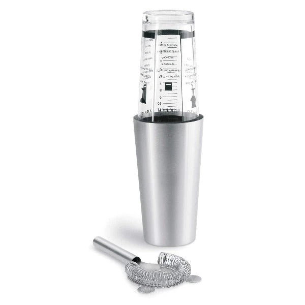 The blomus stainless steel boston cocktail shaker set includes measurements and recipes imprinted on the glass. Rubber edge protects the glass when put together with stainless while shaking. Â Serve directly in glass or use the included strainer to pour. Â Perfect accessory for any bar. The Boston Shaker Set comes with a stainless steel shaker, glass, and sieve. Â The glass shows several cocktail mixtures and their exact dosage. Â