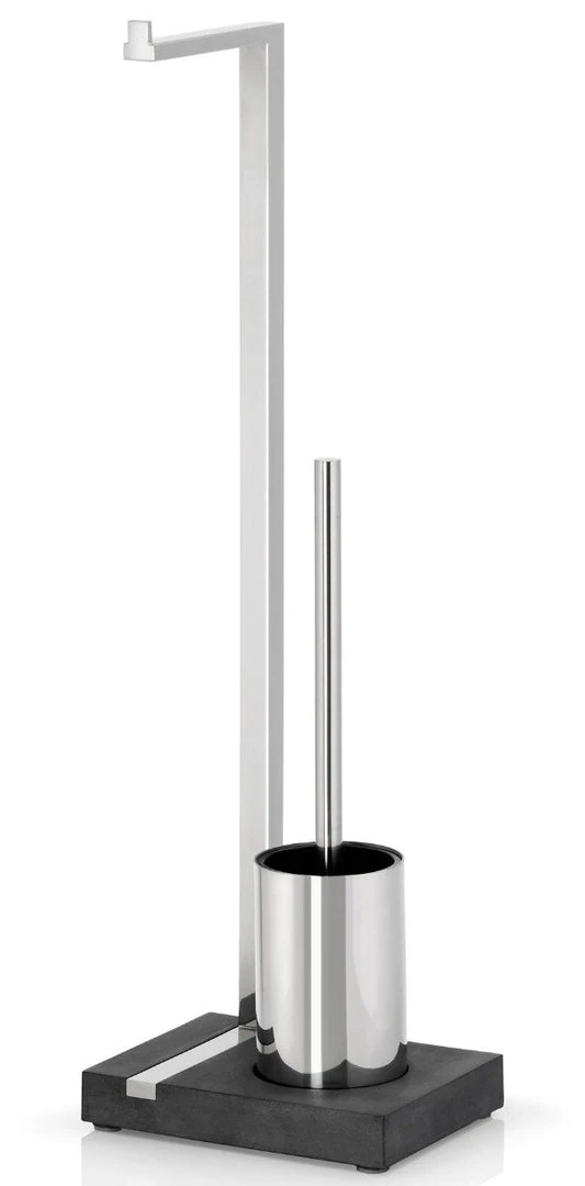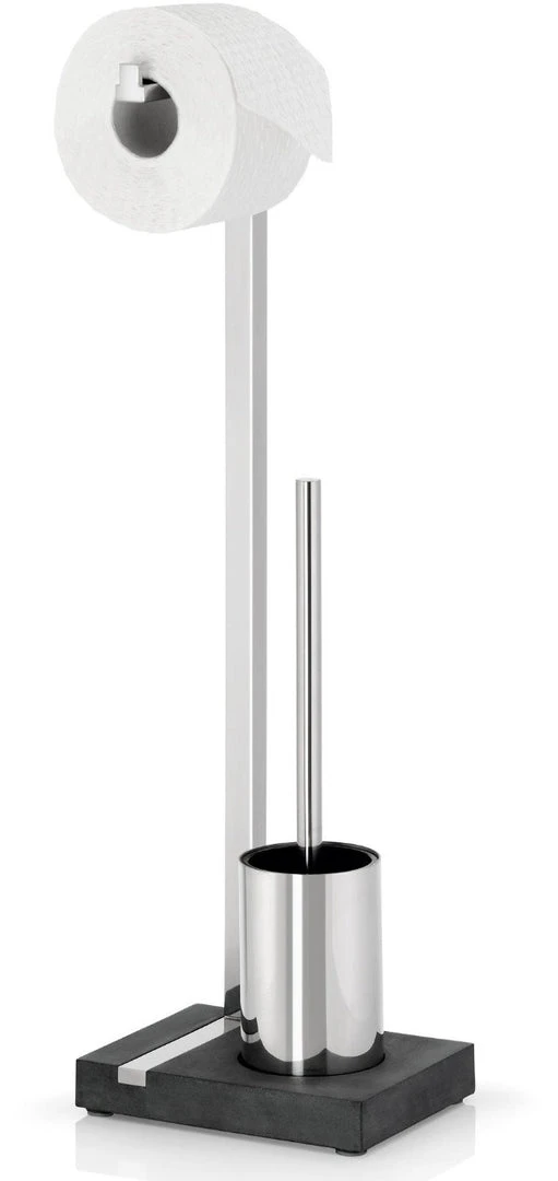 Toilet Butler – Polished 1 Roll organization station by blomus.  A clever combination of warm, dark stone with the cool elegance of polished stainless steel gives this unit its stylish elegant look.  The balanced design of this stand successfully blends the appeal of stainless steel and cast stone. Accommodates 1 roll of tissue paper as well as built tray for the removable toilet brush with holder.  Base is made of polystone which provides both a stylish look and support.