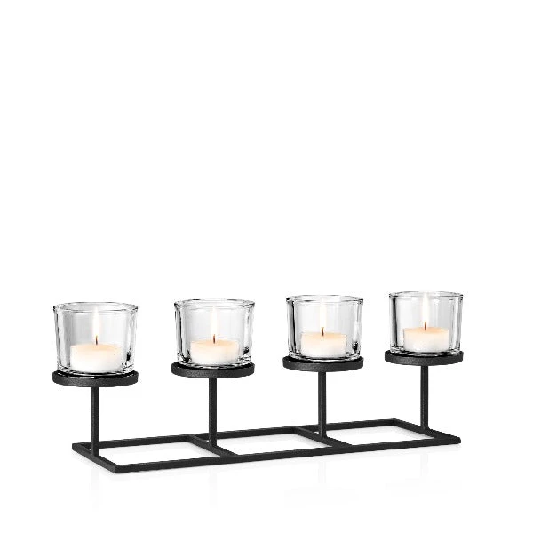 The blomus NERO Tealight Holder With Rectangle Base adds the unique radiance of candlelight to any space.  Perfect framework…perfect design.  The NERO line features black matte powder-coated steel frames combined with clear glass for a comforting material mix. Design is perfect for standard tealight candles, not included.  Perfect for a table centerpiece-decorate the base for a more traditional look.  The NERO range features designs which can be mixed and matched to illuminate your space. Â