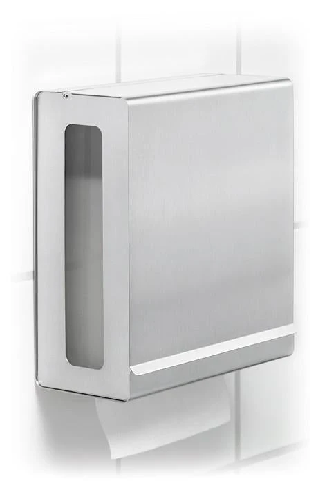 Blomus stainless steel Wall Mounted Paper Towel Dispenser for C-Fold Towels is perfect for home or office. Â The acrylic windows shows the amount of tissues left inside. Â The large flap makes refilling easy. Â Towel opening is 8” x 2 3/4”.’
