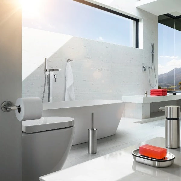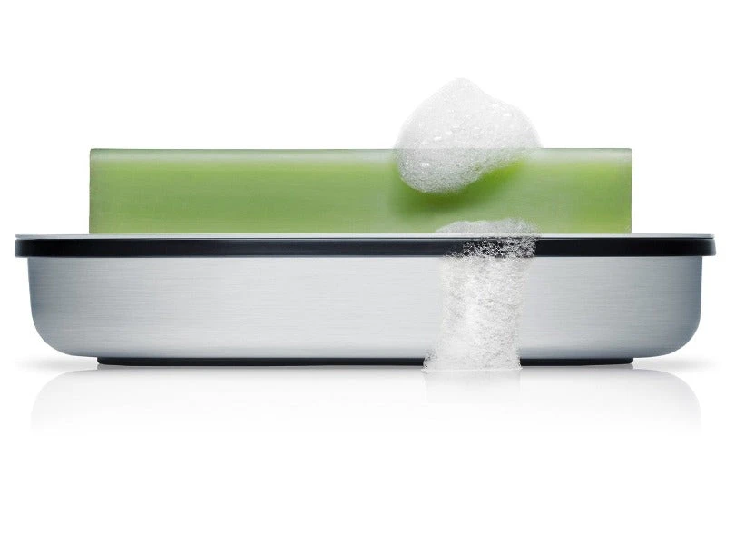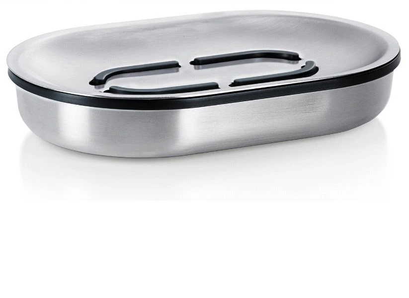 With the blomus AREO Stainless Steel Soap Dish, the extended oval shape with a matt-black plastic trim has become a design feature of the series.  The shape of the soap dish reflects this aesthetic feature of AREO-bathroom accessories.  The removable grate in the Soap Dish allows the soap to dry and also makes for easy cleaning of the dish.  A rubberized base provides a secure, non-slip stand.Â