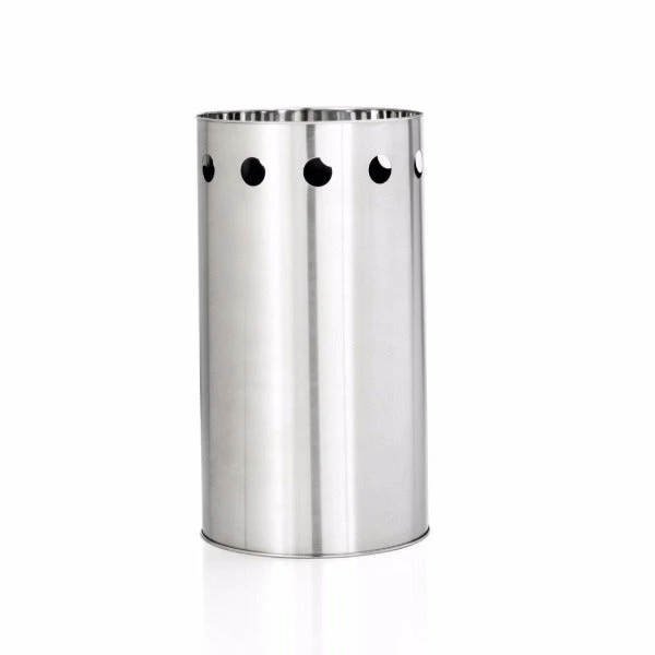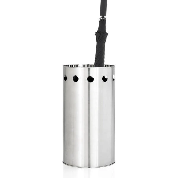 The blomus stainless steel Umbrella Stand – Circles is the perfect solution for storing wet umbrellas. Includes a plastic tray insert for water collection. This umbrella stand features round holes at the top as a design element. Â 6.4 gallon.