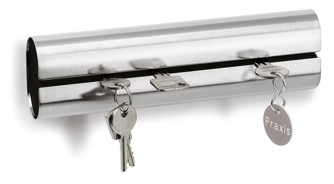 Blomus stainless steel Key Holder – Medium keeps keys organized and easy to access.  Just put your keys into the slot in the middle and they will never be lost again.  The keys are safely held by foamed rubber.  Stylish wall mounted tube with rubber core secures keys until you need them again.  Available in 2 sizes.Â