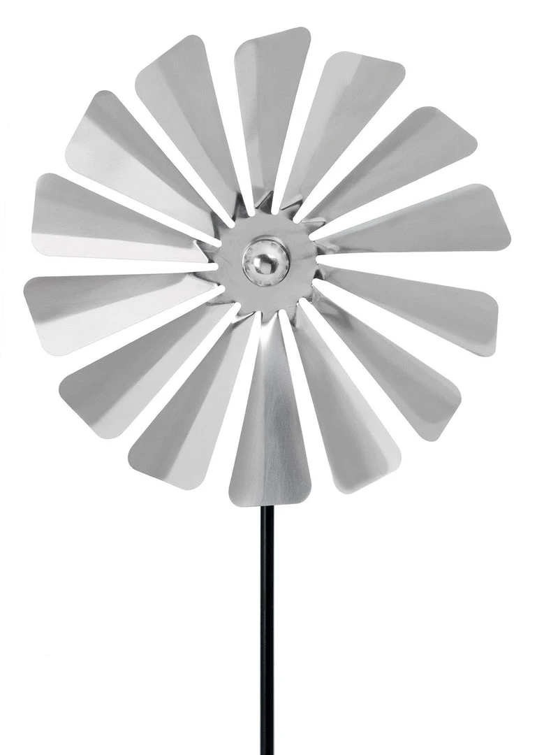 The Pinwheel with Windmill Petals – Small is a nice accessory for garden, balcony or terrace.  The blomus stainless steel pinwheel provides a whimsical garden accessory.  The petals will turn even in a gentle breeze. Minimal assembly is required by placing the pinwheel on the metal ground stake which is included.  Other styles and sizes available.  3 3/4” x 7 7/8” x 27 5/8”.